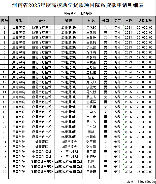 根据河南省教育厅、国家开发银行河南省分行《关于做好 2025 年度高校国家助学贷款工作的通知》(教资助[2025 ]124 号)等文件规定,我院组织开展了2025年度高校国家助学贷款申报、审核工作,现将审核通过的学生名单予以公示。公示期间,如有问题请及时与学院联系。